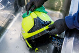 اگر امکان شستشوی کلاه پس از عملیات وجود نداشت، بهتر است در ابتدا با یک پارچه نرم میکرو فایبر اقدام به پاکسازی آلودگیها کنید. بین هر عملیات و شستشوی کلاه نباید وقفه بیافتد. برای شستشوی کلاه، دمای آب باید بین چهل تا چهلوپنج درجه باشد؛ به همین دلیل بهتر است از دستکش استفاده کنید. برای پاکسازی از صابون با PH خنثی استفاده کنید و تمام بخشهای داخلی و خارجی کلاه را کاملاً تمیز کنید. حتی میتوانید از سبد ثابت ماشین لباسشویی نیز برای شستشو استفاده کنید (تستشده). توجه داشته باشید که برای پاکسازی نباید از الکل یا اَستون استفاده کنید. برای خشککردن کلاه، بسته به زمانی که دارید، میتوانید از روشهایی مانند باد گرم سشوار، کابینت خشککن و یا جریان طبیعی هوا استفاده کنید.